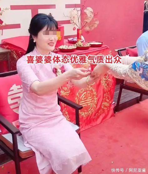 婚典本日,这位女士穿戴一件粉红色的旗袍,看起来温情细密,自然不算苗条,但她的体魄在中年东说念主中算是选藏得很好的。儿媳向她敬茶时,她用双手接茶,算作和脸色皆高傲出极高的领导。