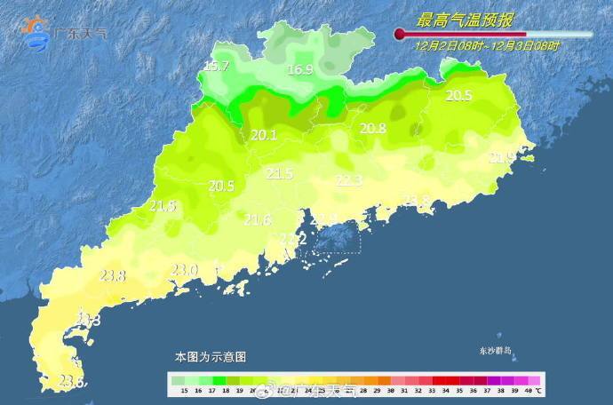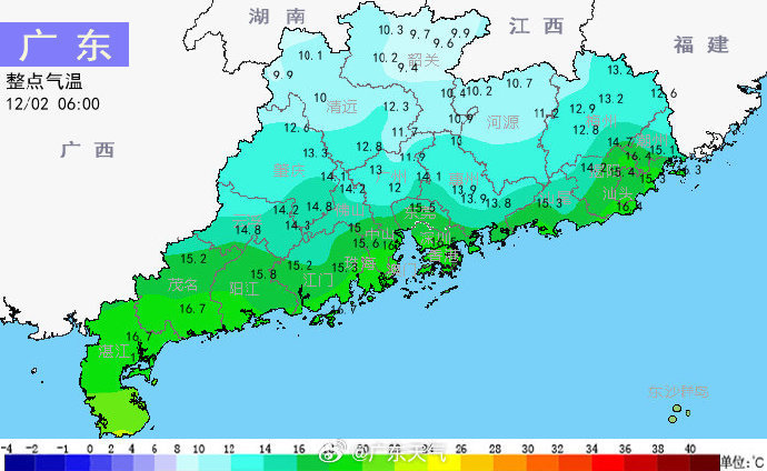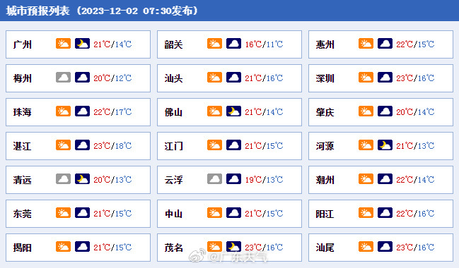12月2日,粤北市县多云到阴天,局部有荒芜小雨,其余市县多云。最低气温:粤北偏北市县8~12℃,南部沿海市县16~19℃,其余市县13~16℃。
