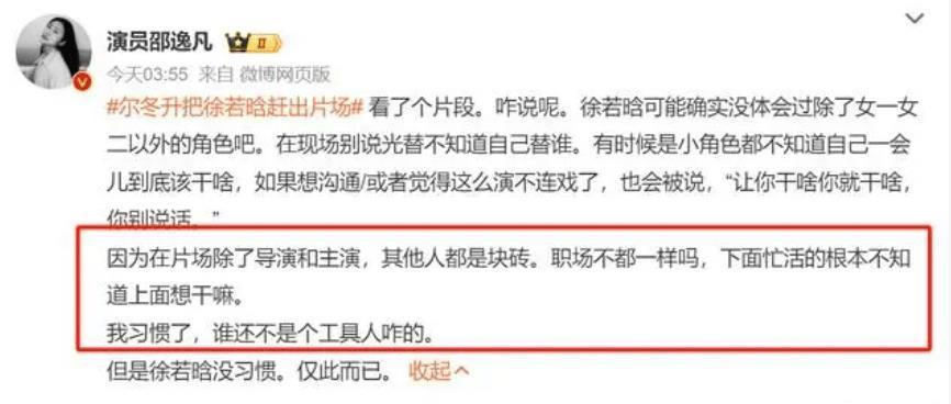 这一事件飞速在网罗上激励了热议。有网友暗示相沿尔冬升导演的决定,合计徐若晗的行动确乎过分,应该受到科罚。也有网友对徐若晗的行动暗示发火,合计她行为一个演员,应该尊重我方的管事和扮装,不应该在片场耍大牌。