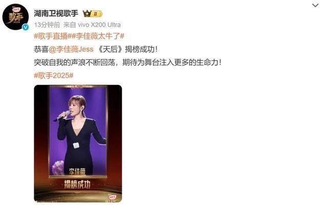 李佳薇的身份是揭榜歌手,选拔了者来女当作揭榜对象,最终揭榜得胜,后者被淘汰。 李佳薇演唱了一首《天后》,千里稳塌实的演唱,加上无尽可击的嗓音,不错说斯须给不雅众注入了热血一般,系数这个词舞台从死气千里千里变得热血滂湃,实力派歌手即是不同样,不搞花里胡梢,一出场即是王炸。